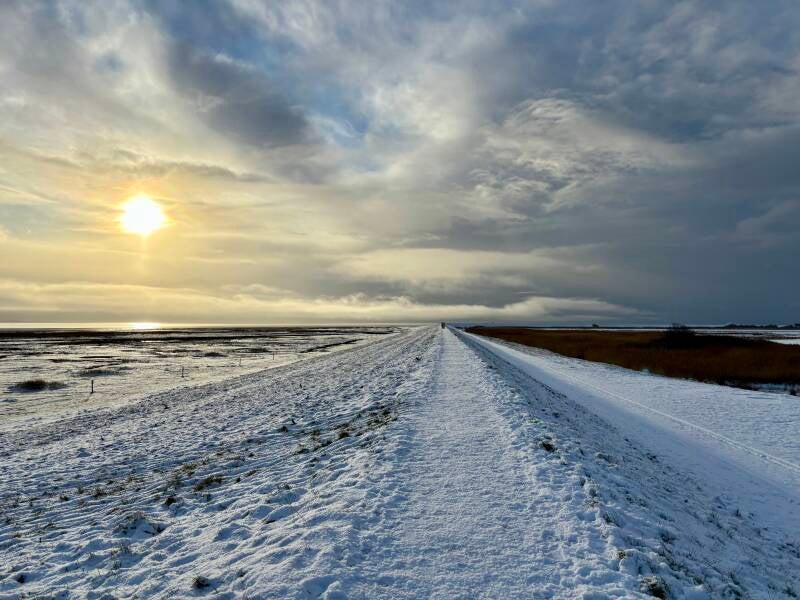 Der Tag begann mit einem wunderschönen Sonnenaufgang, den wir bei einem Spaziergang durch die Winterlandschaft rund um den Leuchtturm Kampen genossen haben.